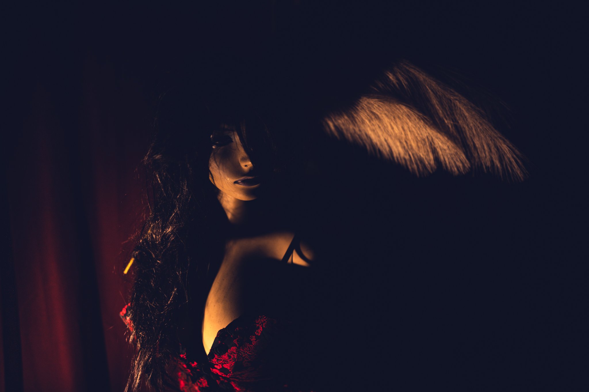 Her skin is covered more by darkness than her dress.